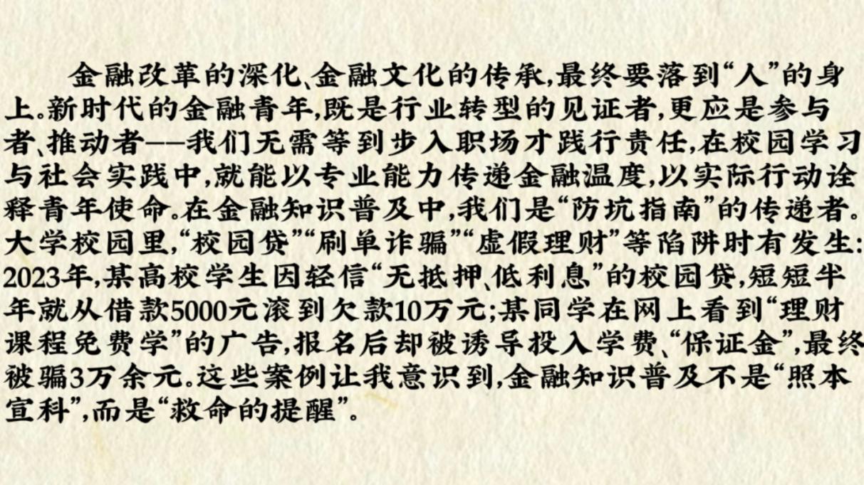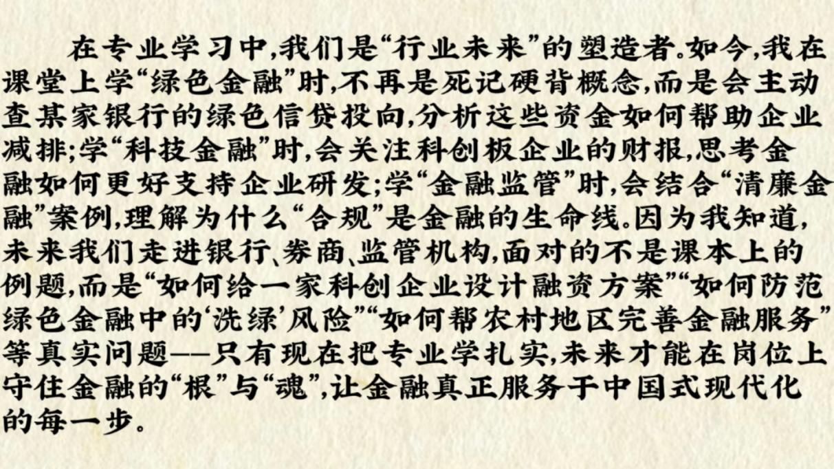 同学们的字里行间,不仅展现了扎实的专业素养,更传递出“与祖国共成长”的坚定信念——从见证祖国金融科技的突飞猛进,到参与绿色金融推动生态建设的实践,再到助力普惠金融服务共同富裕的进程,每一位经金学子的成长轨迹,都与祖国经济社会发展的宏伟蓝图深度契合;每一篇征文里的思考与感悟,都是青春与时代对话、个人与祖国同行的生动注脚。
