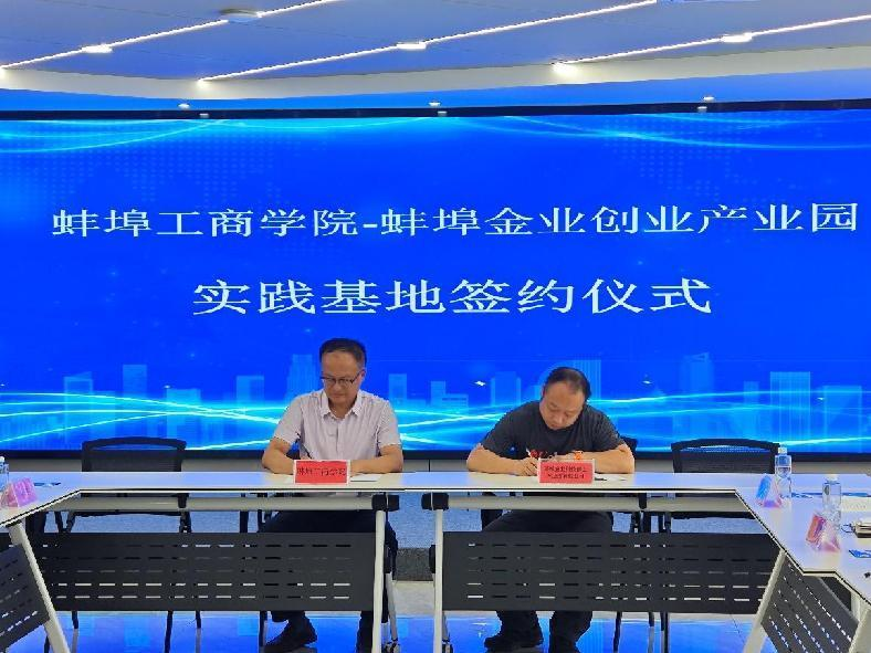 在与会人员的共同见证下,经济与金融学院院长马成文与金业产业园总经理徐翀签订了校企合作框架协议书,蚌埠工商学院副校长江锋为蚌埠金业创业产业园授牌并合影留念。仪式结束后,江锋一行还参观了金业创业产业园展厅。