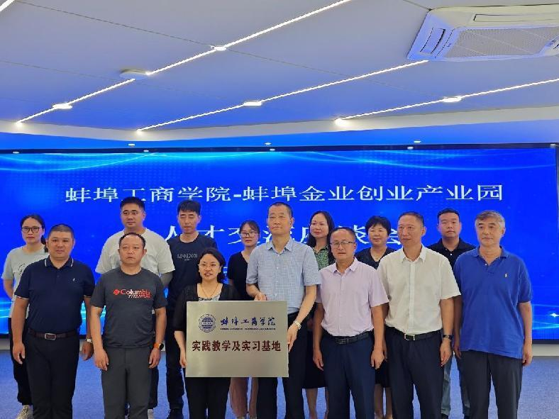 在与会人员的共同见证下,经济与金融学院院长马成文与金业产业园总经理徐翀签订了校企合作框架协议书,蚌埠工商学院副校长江锋为蚌埠金业创业产业园授牌并合影留念。仪式结束后,江锋一行还参观了金业创业产业园展厅。