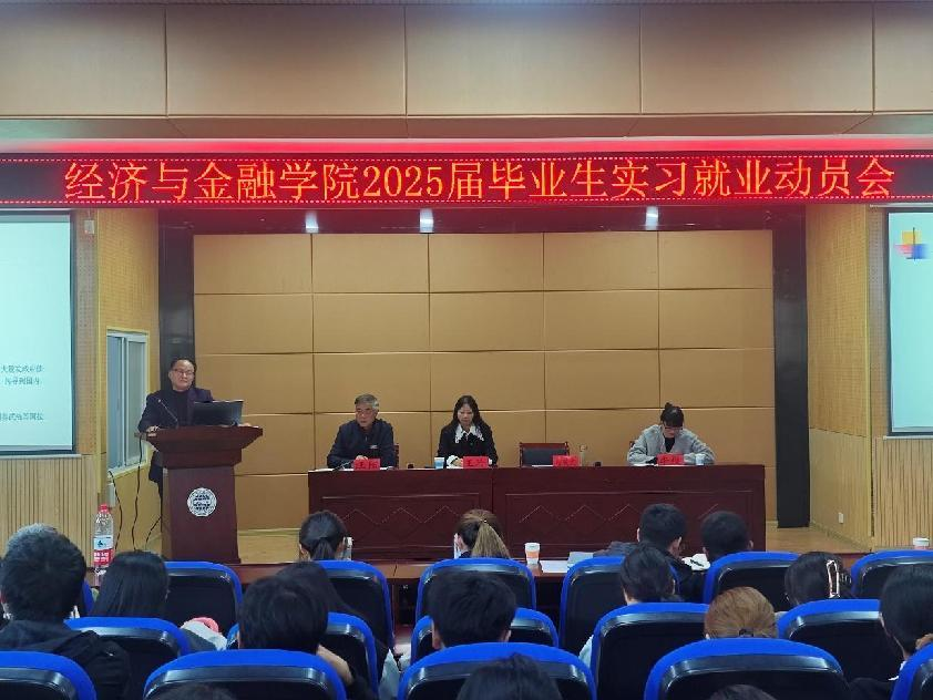 为扎实推进2025届毕业生实习就业工作,引导学生树立正确的实习就业观念,强化学生的安全意识和责任意识。11月6日下午,经济与金融学院在格物楼B101报告厅召开2025届毕业生实习就业动员会。学生处副处长、就业指导中心主任王玲,经济与金融学院院长马成文、党总支副书记汪阳、副院长李侠出席会议;各系部主任、毕业班辅导员、全体2025届毕业生参加会议,会议由汪阳主持。
