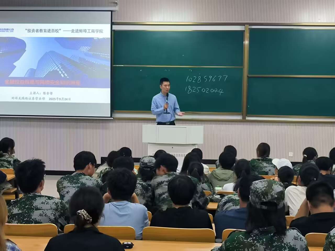 为有效提升大学生防范网络诈骗意识,推动并强化有关金融权益的知识普及与宣传,充分发挥金融机构在投资者保护与提升国民金融素养工作中的作用,9月24日傍晚经济与金融学院联合信达证券蚌埠龙腾路证券营业部在笃行楼A202教室举办了关于“金融权益保障与网络安全知识”的投资者教育进百校讲座。此次讲座由学院实验室主任聂伟康主持,信达证券投资顾问陈金哲主讲,近150名来自金融学、投资学专业的大一新生参加活动。