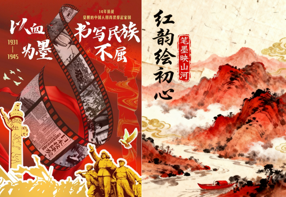 本次大赛以“红色文化、革命历史、时代新貌”为核心,鼓励参赛者以多元视角挖掘红色内涵、用艺术语言讲述红色故事。参赛作品创意新颖、风格各异,尽显学子巧思:或借水墨山河衬红绸红船,绘就“初心映山河”的诗意;或用复古胶片串抗战史料,凝刻“以血为墨”的悲壮;或凭长城古建铺金色云纹,注入“青春绘新卷”的朝气。虽创作手法不同,但所有作品皆承载炽热家国情怀,生动展现新时代青年传承红色基因、担当时代使命的自觉,每一幅都彰显蓬勃青春风采。