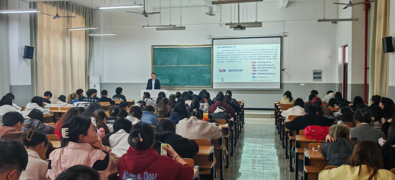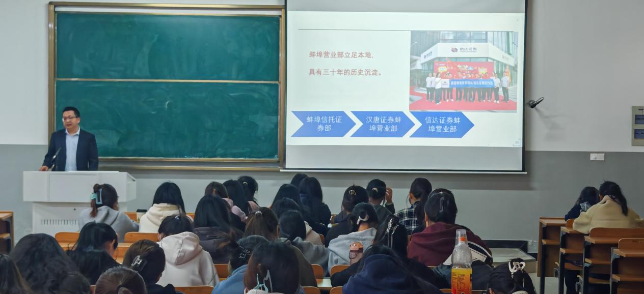 为使学生全面了解金融行业,拓宽就业渠道认知,11月12日下午,经济与金融学院联合信达证券蚌埠龙腾路证券营业部在笃行楼B101教室成功举办了“了解证券公司,拓宽就业渠道”专题讲座,此次讲座由学院实验室主任聂伟康主持,信达证券投资顾问崔小雨主讲,超过100名来自金融学专业的大四学生参加活动。