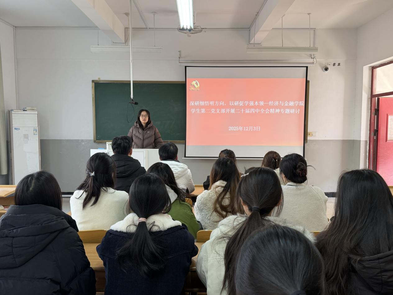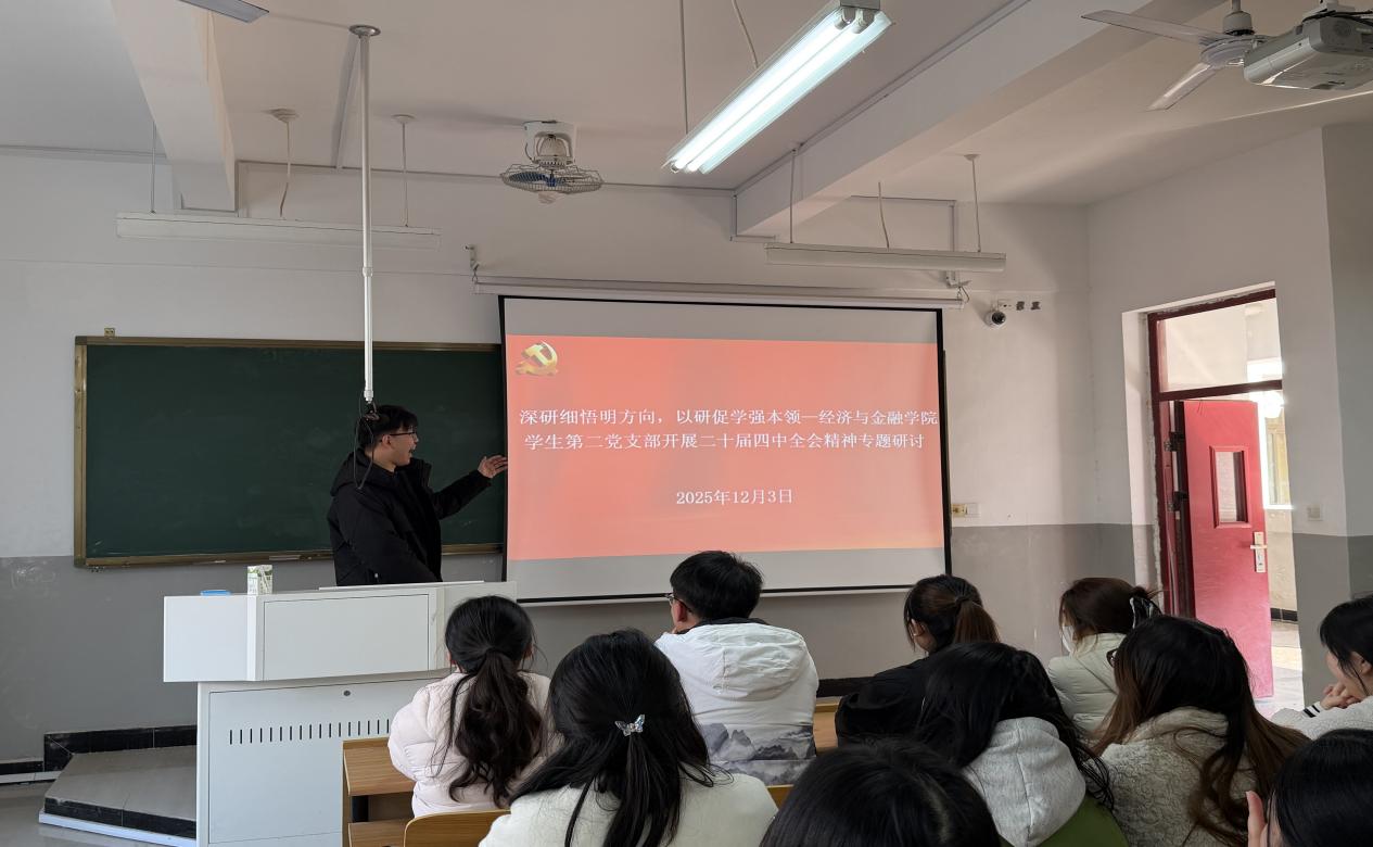 为推动党的二十届四中全会精神学习走深走实,引导学生党员将理论学习与专业实践紧密结合,12月3日,经济与金融学院学生第二党支部在明理楼C201教室组织开展党的二十届四中全会精神专题研讨会。本次研讨会由支部书记路晨静主持,支部全体党员参会。