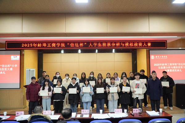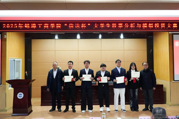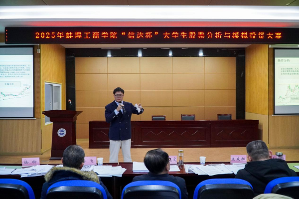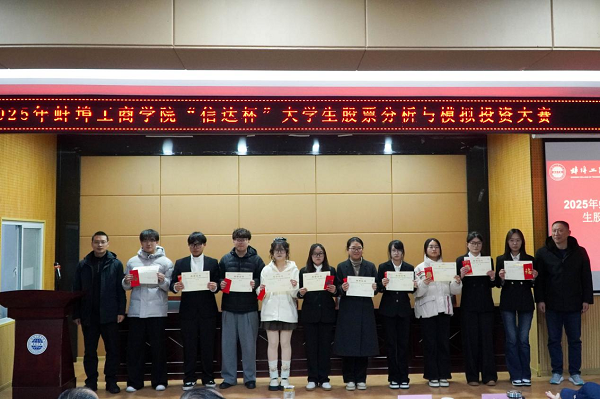2025年12月17日下午,由蚌埠工商学院创业学院主办,经济与金融学院承办,信达证券股份有限公司蚌埠龙腾路营业部赞助的第三届蚌埠工商学院“信达杯”大学生股票分析与模拟投资大赛的决赛暨颁奖典礼隆重举行,从733名参赛选手中脱颖而出的15名选手及所在团队在格物楼B101教室角逐决赛的一、二等奖。本场决赛由经济与金融学院实验室主任聂伟康主持,信达证券合肥营业部总经理李飞、信达证券蚌埠龙腾路营业部总经理徐柳、蚌埠工商学院学生处处长王东辉教授、蚌埠工商学院经济与金融学院院长马成文教授以及蚌埠工商学院财务与会计学院专任教师叶方同副教授作为嘉宾和评委出席,部分经济与金融学院专任教师及超过150名同学到场进行观摩。
