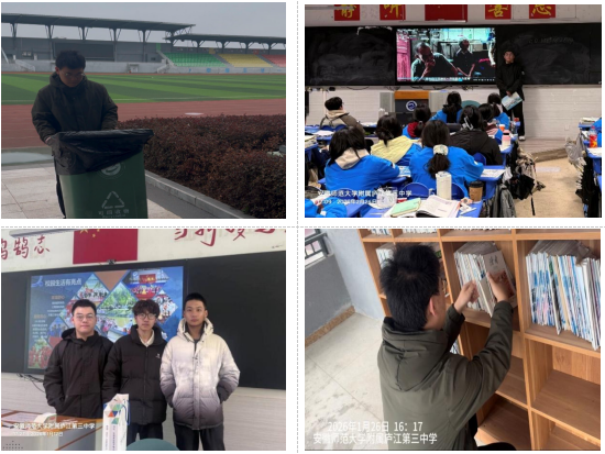 24金融2班张书童同学重返安徽师范大学附属庐江第三中学,开展为期7天的志愿服务。他分享备考经验、参与校园铲雪、整理复习资料、布置励志文化墙,协助考试监考与百日誓师保障工作,以实际行动守护校园、助力学弟学妹成长,在传承与回馈中坚定志愿服务初心。